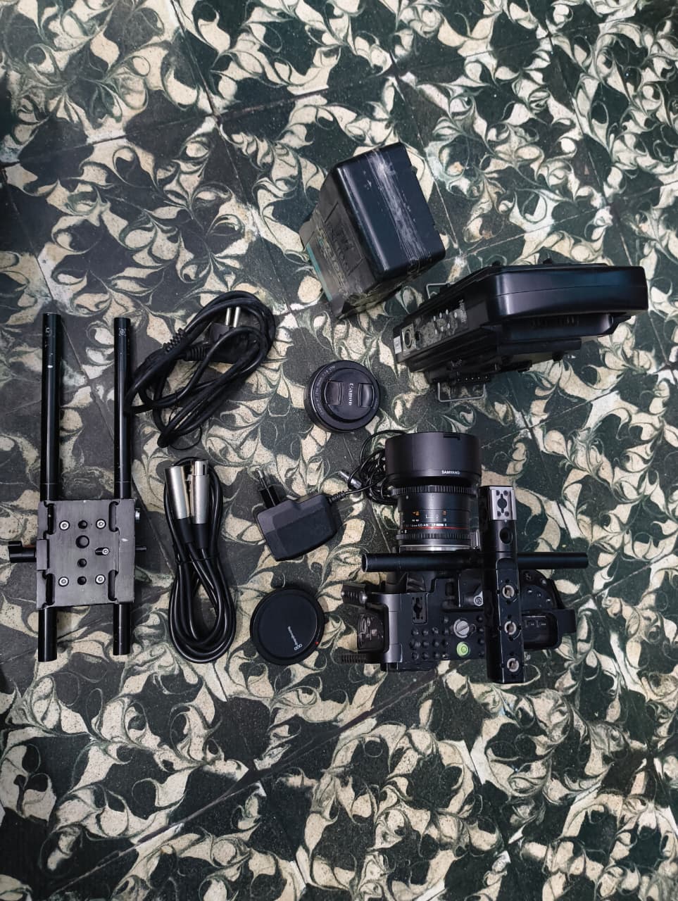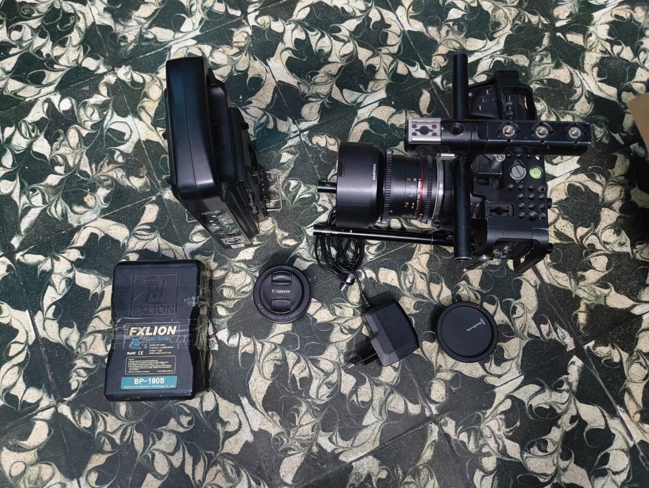 | Includes | cage,lens,50mm lens,14mm lens,v mount battery,v mount charger,rail rig,AC power adapter everything as mention above |
